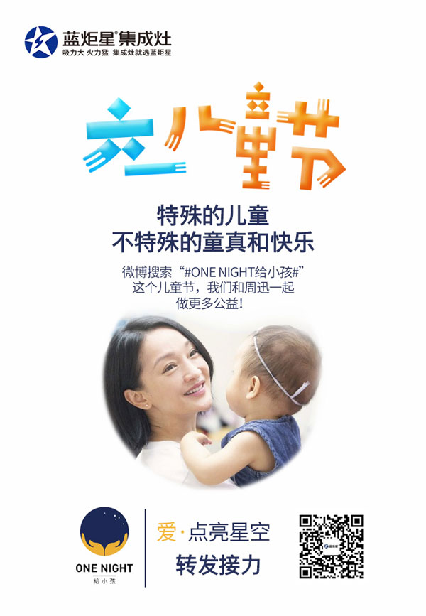 2019年兒童節(jié),藍(lán)炬星集成灶攜手“ONENIGHT給小孩”的發(fā)起人周迅,呼吁社會關(guān)注這群可愛的“來自星星的孩子”。