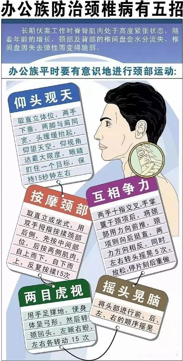 長期伏案工作者,每小時應有5—10分鐘的休息時間,并做頸椎自我保健操。加強頸肩部肌肉的鍛煉,既可緩解疲勞,又能使肌肉發達,韌度增強,從而有利于頸段脊柱的穩定性,增強頸肩順應頸部突然變化的能力。